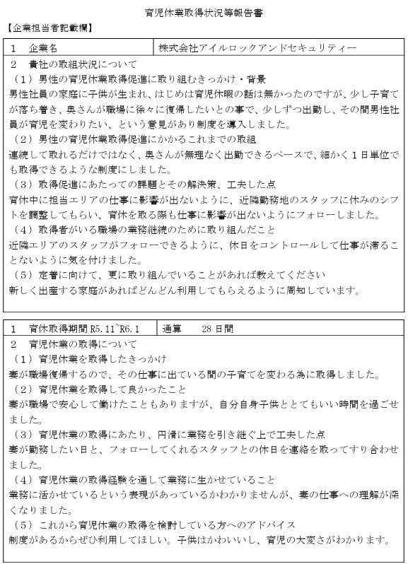 いま、株式会社アイルロックアンドセキュリティーでは男性の育休取得推進を推奨しています。